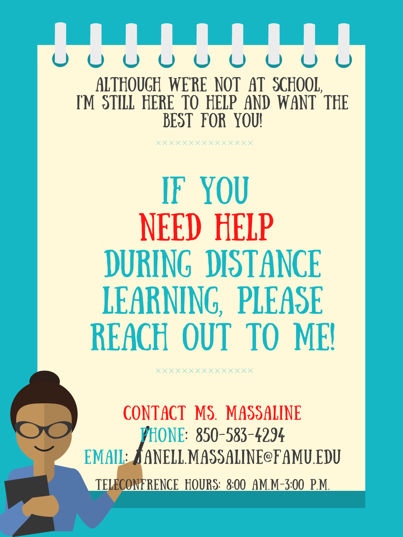 Students please ensure that you are tuning within your allotted conference time as I want to make sure that I am able to reach all who need assistance to the best of my ability during distance learning.